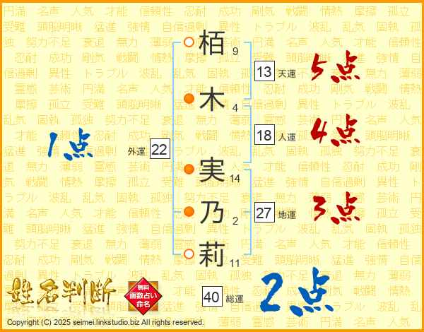 栢(9画)木(4画) 実(14画)乃(2画)莉(11画)