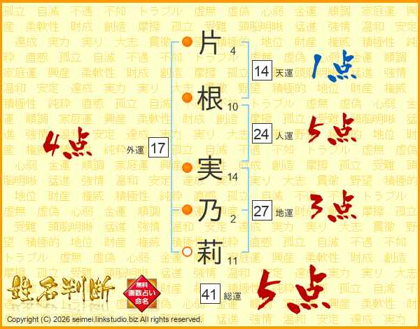 片(4画)根(10画) 実(14画)乃(2画)莉(11画)