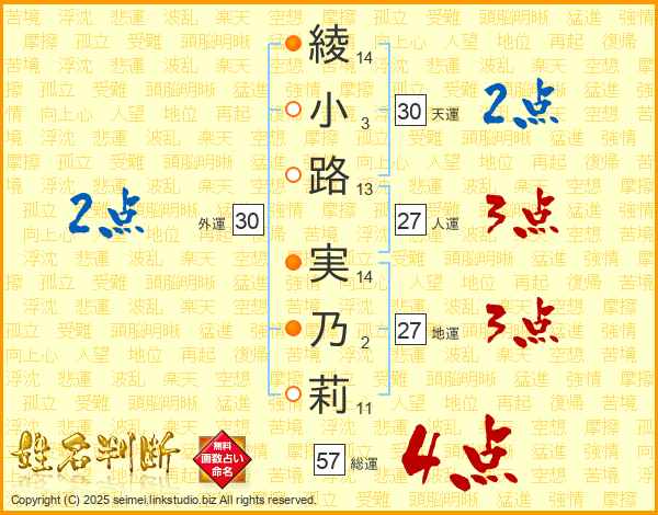 綾(14画)小(3画)路(13画) 実(14画)乃(2画)莉(11画)