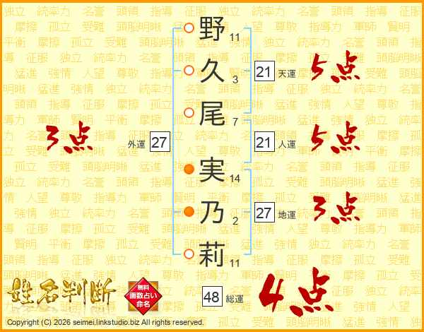 野(11画)久(3画)尾(7画) 実(14画)乃(2画)莉(11画)