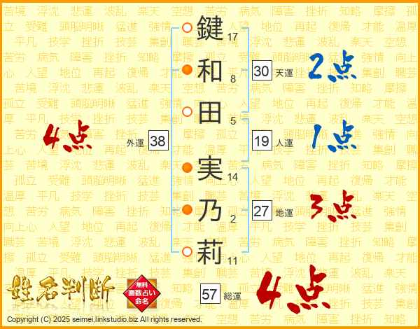 鍵(17画)和(8画)田(5画) 実(14画)乃(2画)莉(11画)