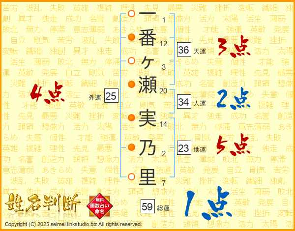 一番ヶ瀬実乃里さんの総運は59画の1点!