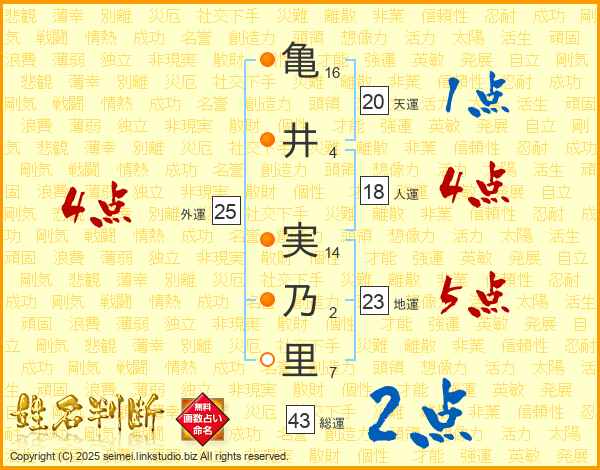 亀(16画)井(4画) 実(14画)乃(2画)里(7画)
