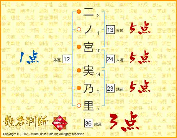 二(2画)ノ(1画)宮(10画) 実(14画)乃(2画)里(7画)