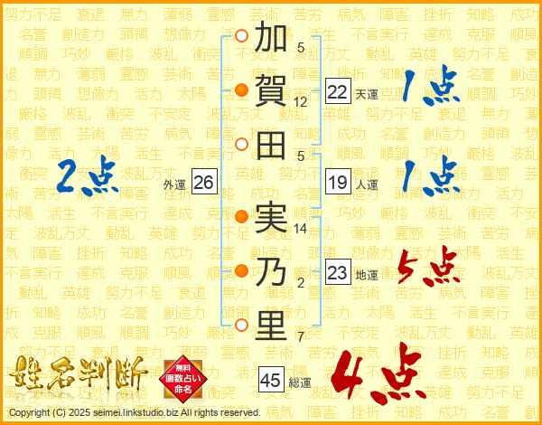 加(5画)賀(12画)田(5画) 実(14画)乃(2画)里(7画)