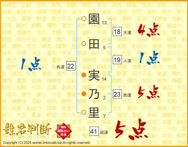 園(13画)田(5画) 実(14画)乃(2画)里(7画)