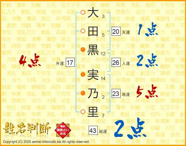 大(3画)田(5画)黒(12画) 実(14画)乃(2画)里(7画)