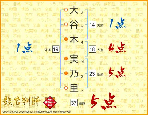 大(3画)谷(7画)木(4画) 実(14画)乃(2画)里(7画)
