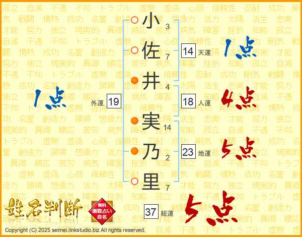 小(3画)佐(7画)井(4画) 実(14画)乃(2画)里(7画)