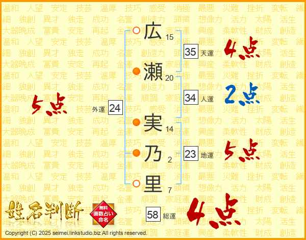 広(15画)瀬(20画) 実(14画)乃(2画)里(7画)