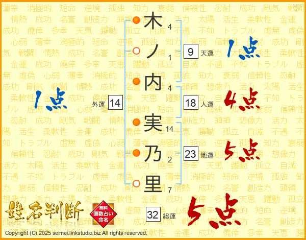 木(4画)ノ(1画)内(4画) 実(14画)乃(2画)里(7画)
