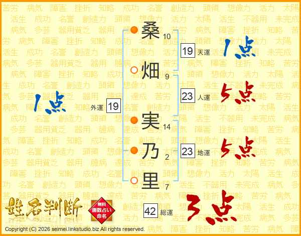 桑(10画)畑(9画) 実(14画)乃(2画)里(7画)