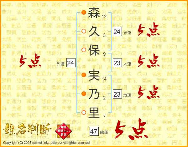 森(12画)久(3画)保(9画) 実(14画)乃(2画)里(7画)