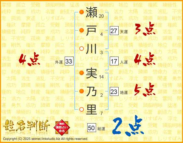 瀬(20画)戸(4画)川(3画) 実(14画)乃(2画)里(7画)