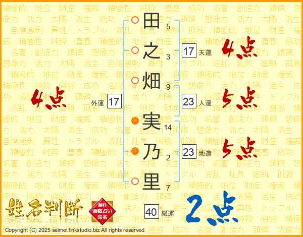 田(5画)之(3画)畑(9画) 実(14画)乃(2画)里(7画)