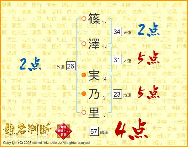 篠(17画)澤(17画) 実(14画)乃(2画)里(7画)