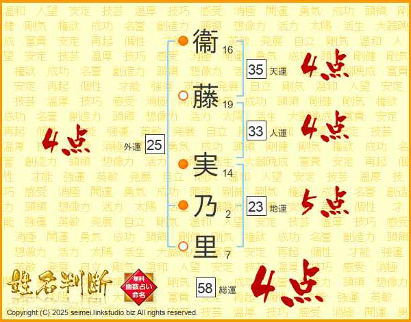 衞(16画)藤(19画) 実(14画)乃(2画)里(7画)
