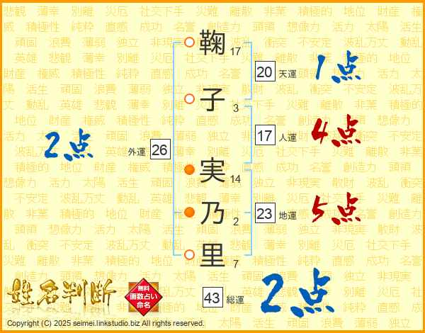鞠(17画)子(3画) 実(14画)乃(2画)里(7画)