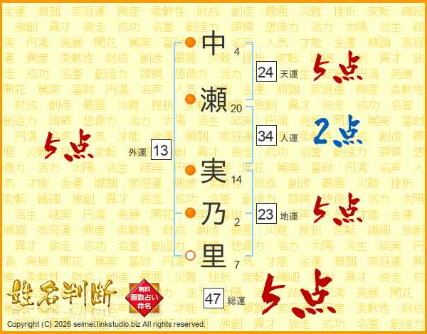 中瀬実乃里さんの総運は47画の5点!