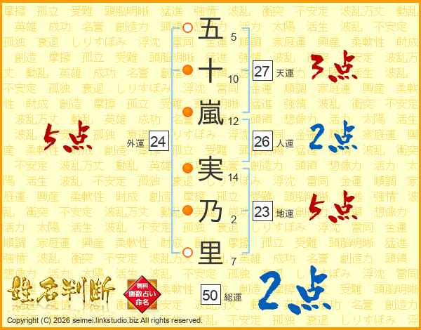 五十嵐実乃里さんの総運は50画の2点!