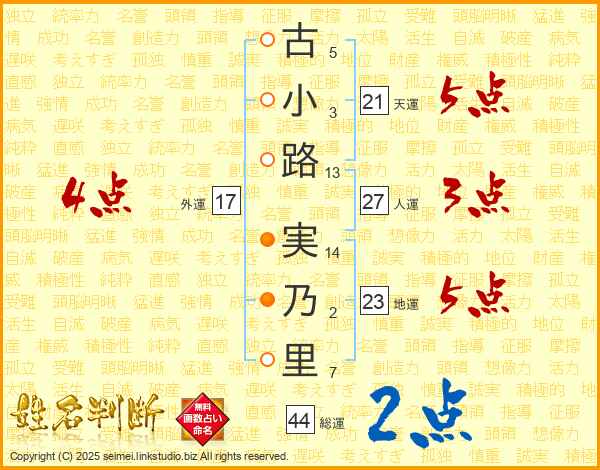 古(5画)小(3画)路(13画) 実(14画)乃(2画)里(7画)