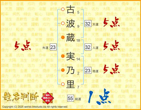 古(5画)波(9画)蔵(18画) 実(14画)乃(2画)里(7画)