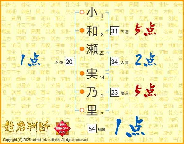 小(3画)和(8画)瀬(20画) 実(14画)乃(2画)里(7画)