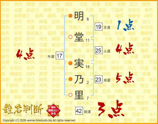 明(8画)堂(11画) 実(14画)乃(2画)里(7画)