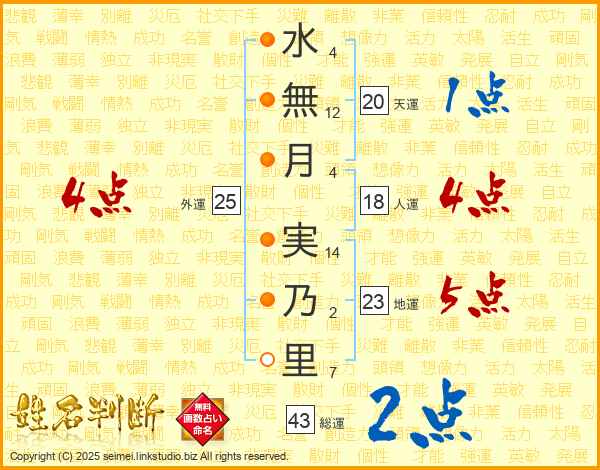 水(4画)無(12画)月(4画) 実(14画)乃(2画)里(7画)
