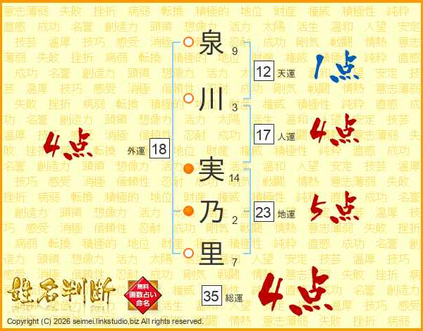 泉(9画)川(3画) 実(14画)乃(2画)里(7画)