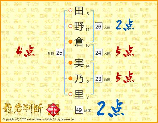 田(5画)野(11画)倉(10画) 実(14画)乃(2画)里(7画)