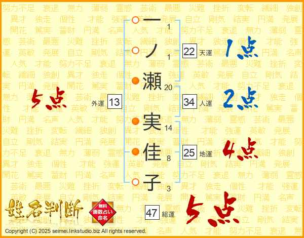 一(1画)ノ(1画)瀬(20画) 実(14画)佳(8画)子(3画)