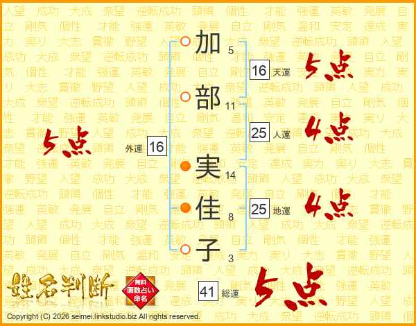 加(5画)部(11画) 実(14画)佳(8画)子(3画)