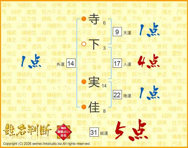寺(6画)下(3画) 実(14画)佳(8画)
