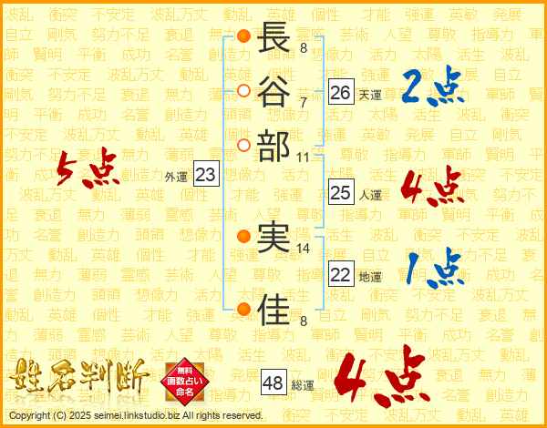 長(8画)谷(7画)部(11画) 実(14画)佳(8画)