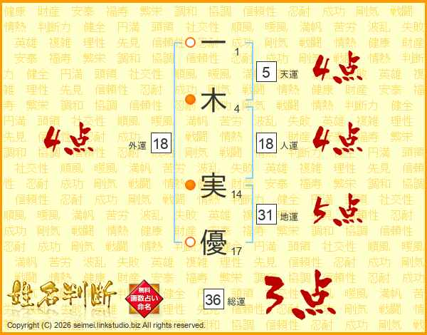 生活面を象徴する運勢です。外部から受ける影響力を表し、結婚運、家庭運や職場、環境への順応性を表します。総運から人運を引いた画数。姓や名が1文字の場合を除く。