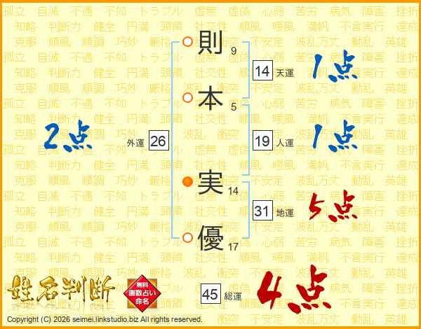生活面を象徴する運勢です。外部から受ける影響力を表し、結婚運、家庭運や職場、環境への順応性を表します。総運から人運を引いた画数。姓や名が1文字の場合を除く。