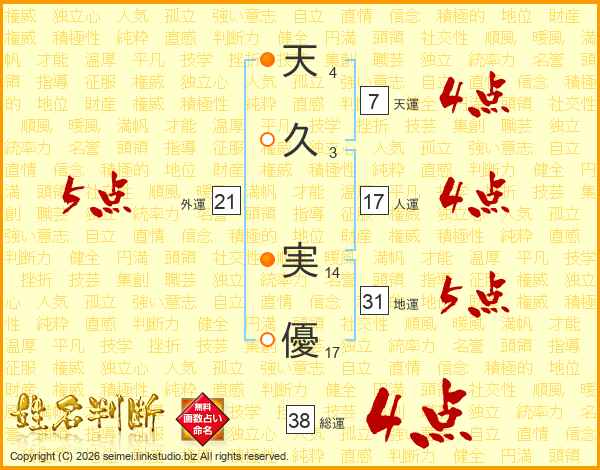 生活面を象徴する運勢です。外部から受ける影響力を表し、結婚運、家庭運や職場、環境への順応性を表します。総運から人運を引いた画数。姓や名が1文字の場合を除く。