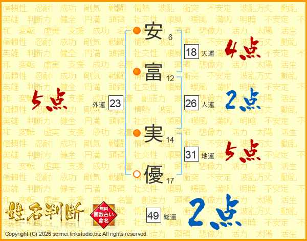 安(6画)富(12画) 実(14画)優(17画)