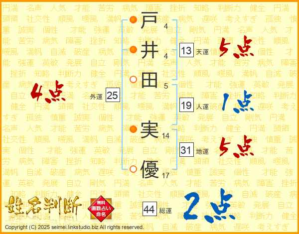 戸(4画)井(4画)田(5画) 実(14画)優(17画)