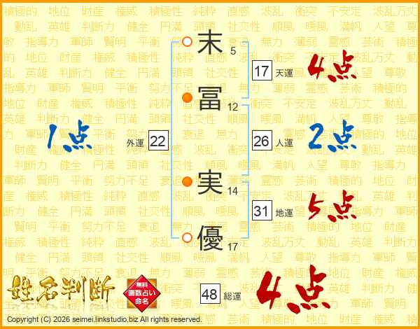 生活面を象徴する運勢です。外部から受ける影響力を表し、結婚運、家庭運や職場、環境への順応性を表します。総運から人運を引いた画数。姓や名が1文字の場合を除く。