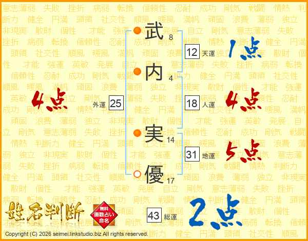 武(8画)内(4画) 実(14画)優(17画)
