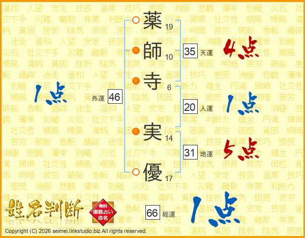薬(19画)師(10画)寺(6画) 実(14画)優(17画)