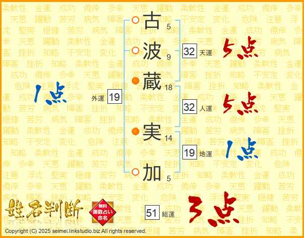 古(5画)波(9画)蔵(18画) 実(14画)加(5画)