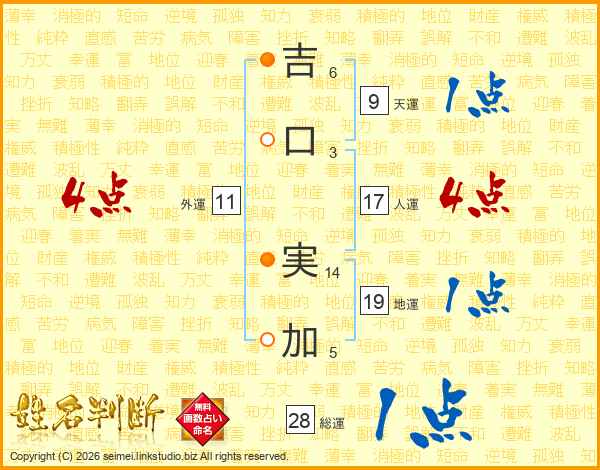 生活面を象徴する運勢です。外部から受ける影響力を表し、結婚運、家庭運や職場、環境への順応性を表します。総運から人運を引いた画数。姓や名が1文字の場合を除く。
