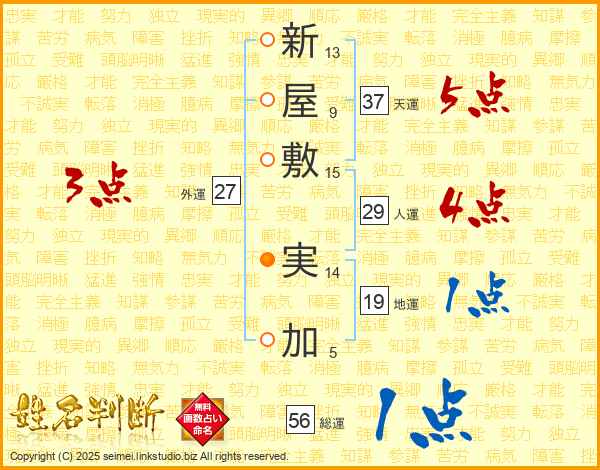 新(13画)屋(9画)敷(15画) 実(14画)加(5画)