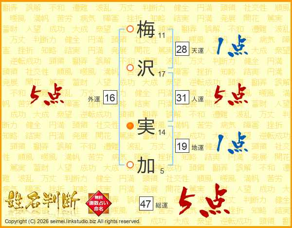 梅(11画)沢(17画) 実(14画)加(5画)