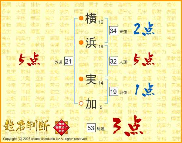 生活面を象徴する運勢です。外部から受ける影響力を表し、結婚運、家庭運や職場、環境への順応性を表します。総運から人運を引いた画数。姓や名が1文字の場合を除く。