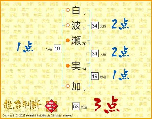 白(5画)波(9画)瀬(20画) 実(14画)加(5画)