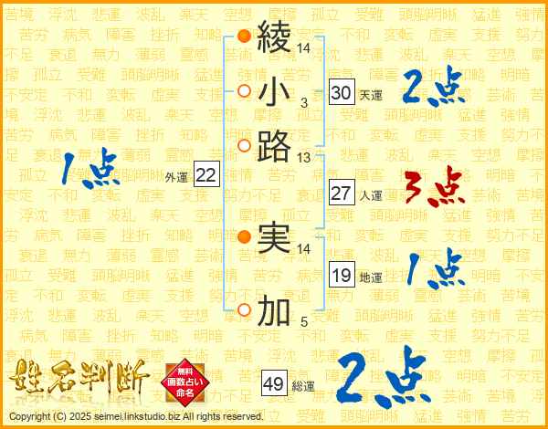 綾(14画)小(3画)路(13画) 実(14画)加(5画)